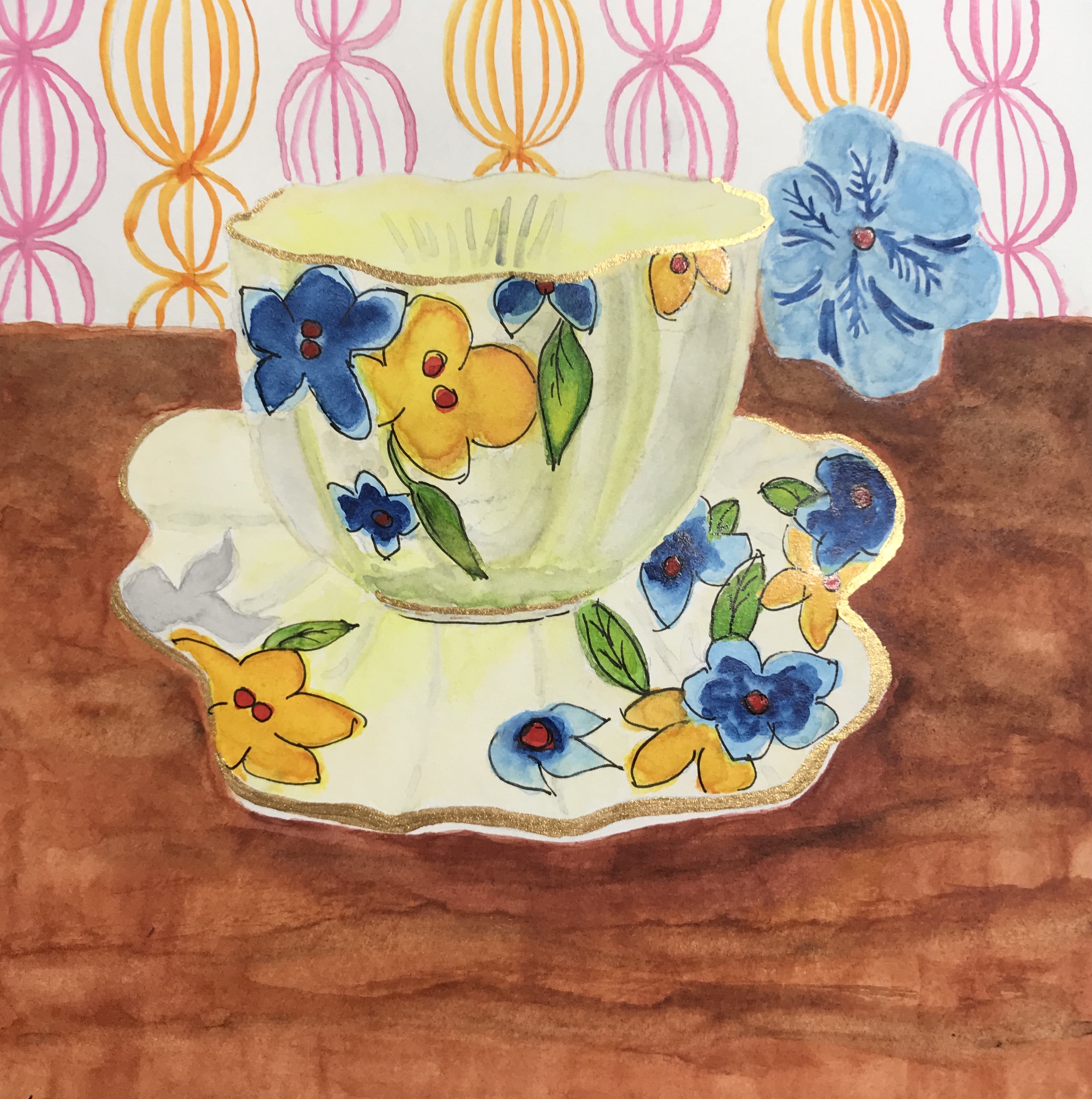 Today's practice is a second teacup. This one has been sketched with a mechanical pencil (HB core) and painted with Japanese watercolors. A gold acrylic paint was used for the edging. Some additional embellishment was done with a black Pentel PointLiner pen (0.3 mm).