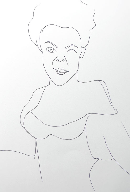 The 5-minute sketch below gives a solid hint as to the figure's outline, gender, hairstyle and pose. As for the finished effort, it lends a much greater sense of realism to the face and its expression. In addition, the detail of the clothing includes a corset and lace fabric and trims. I really enjoy making the random marks that become the lace areas! Plus, the pose is clarified to show she is leaning on one arm.